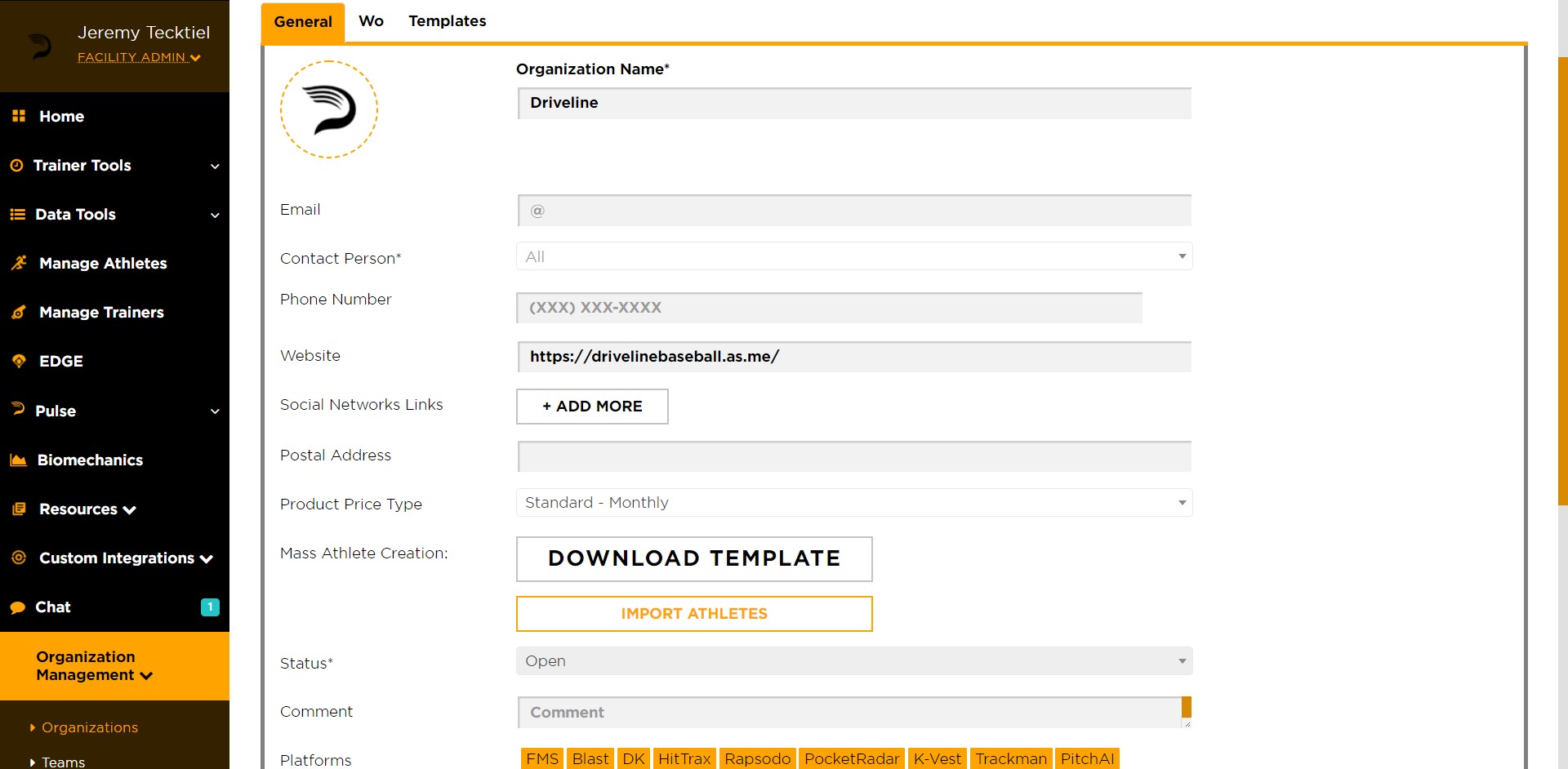 After selecting an Organization, from the General tab on this page you can edit certain aspects of your facility such as contact information and links to social networks or Acuity scheduling pages.